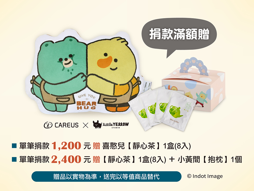 單筆捐款2,400元,贈喜憨兒【靜心茶一盒(8入)+小黃間抱枕一組】。