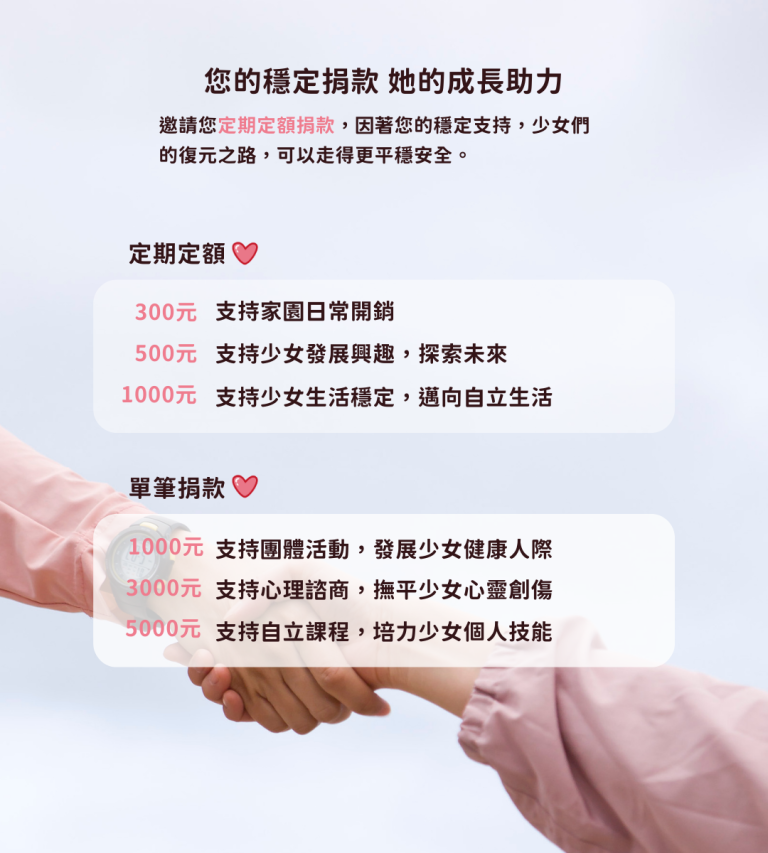 ●支持陪伴:24小時、風雨無阻的「替代性家庭服務模式」,滿足少女食、衣、住、行、育、樂等各方面之需求,提供安全、穩定的生活環境。