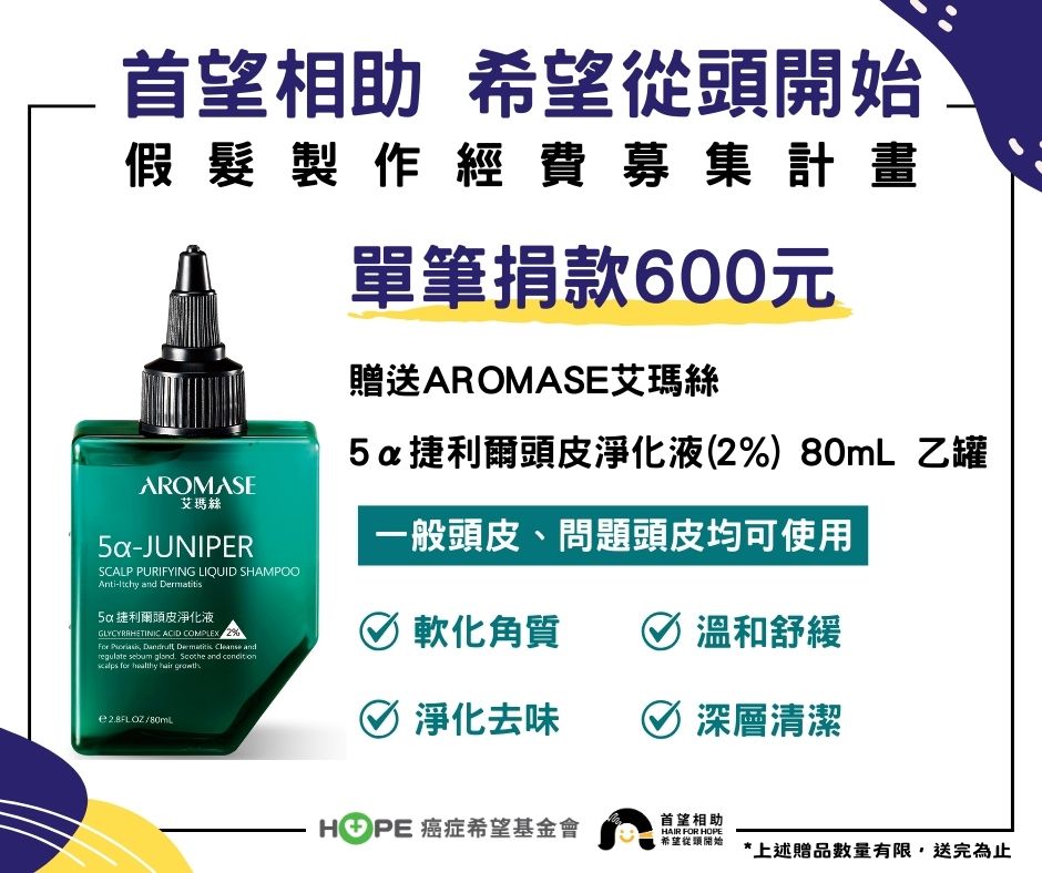 ● 單筆捐款滿600元:贈送AROMASE艾瑪絲5α捷利爾頭皮淨化液(2%) 80mL 乙罐