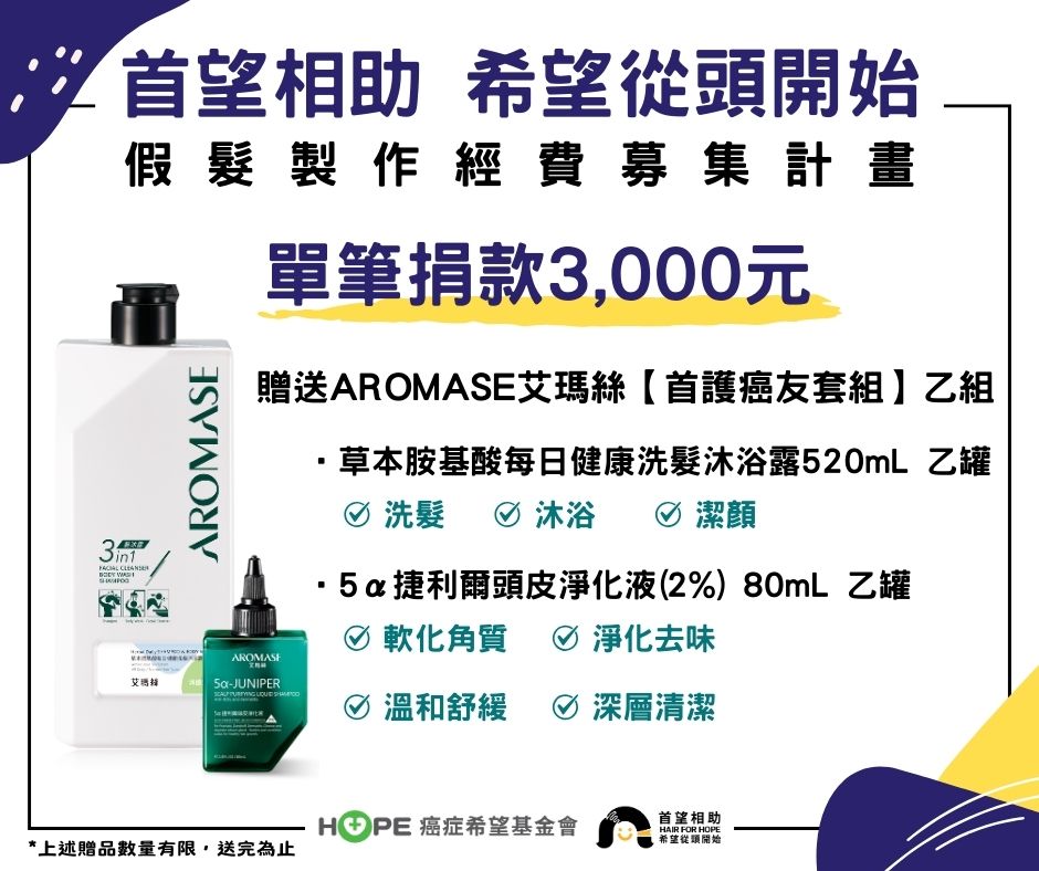 ● 單筆捐款滿3,000元:贈送AROMASE艾瑪絲【首護癌友套組】乙組 (贈品數量有限,送完為止)