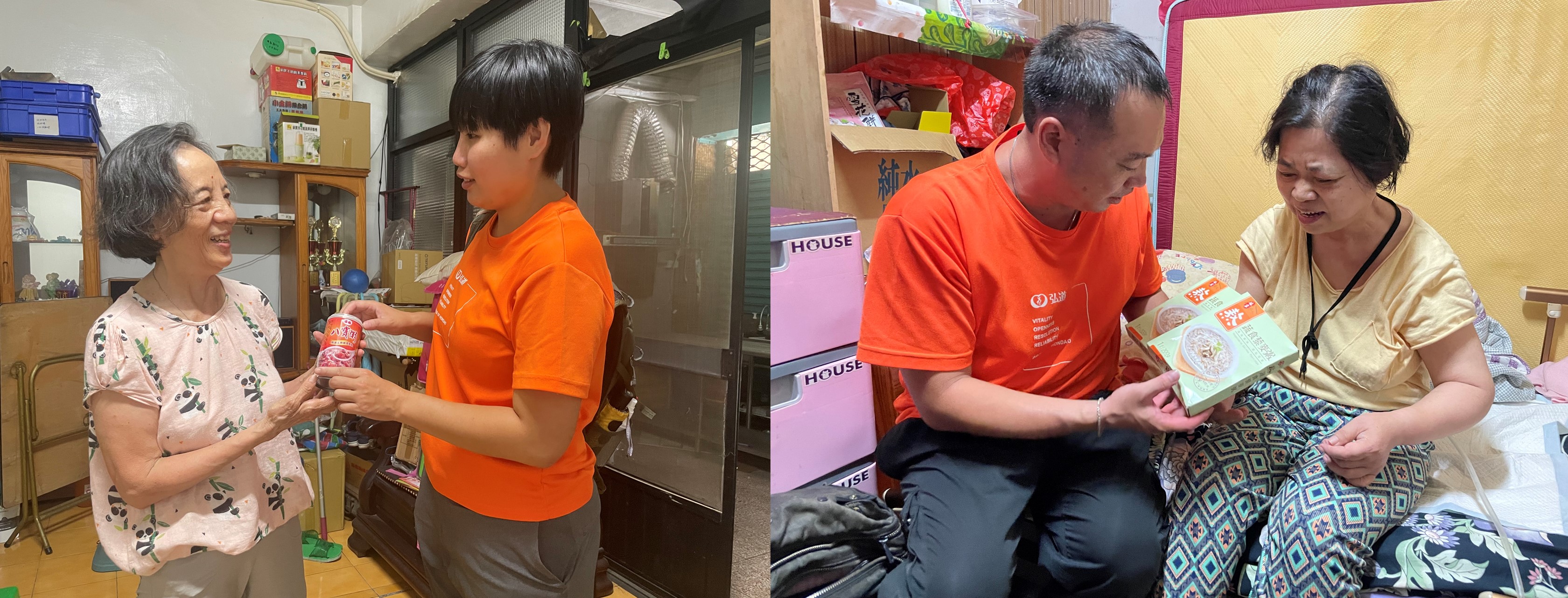 在過去的生活裡,阿公因為經濟問題,總是有一餐沒一餐,有時拿到食物,會反覆的煮,所謂的配菜也不過是罐頭,不只吃得不健康,更因疾病的關係害怕上廁所,連水都不敢喝太多。直到弘道開始服務,提供早餐物資並主動關懷阿公的生活,雖然沒辦法完全改善,但至少有餘裕可以買一些肉、蛋、鮮食等並稍稍減緩租屋壓力。
