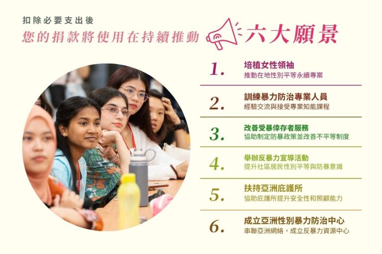自2012年起,我們和亞洲各地的夥伴展開女孩培力計畫、推動倡議,並舉辦國際性別暴力防治研習團,促進亞洲各國交流性別暴力防治經驗。