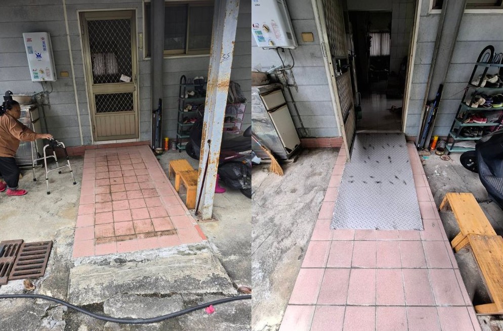 在仁愛鄉,我們服務一位 69 歲的長輩,因雙膝嚴重變形無法久站,只能依靠助步器或輪椅代步。然而,長輩的家中有好幾道門檻,每一次跨越對他而言都是一場挑戰,也增加了跌倒的風險。當照顧者推著輪椅進出時,更常因高度落差而驚險連連。