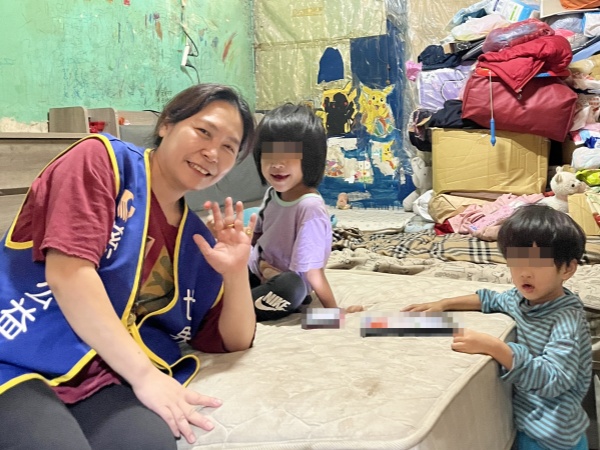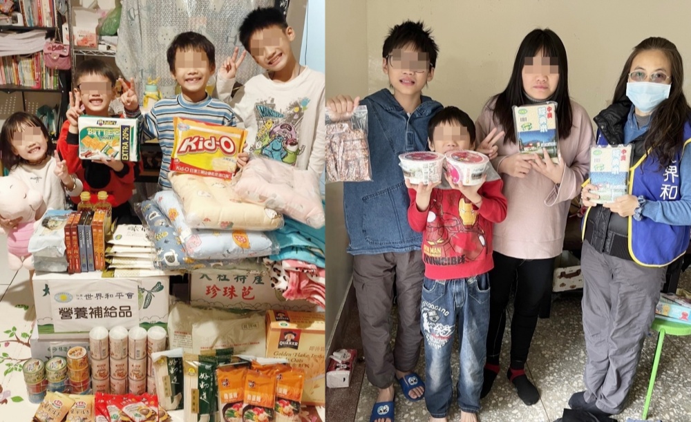 沿著窄小幽暗的階梯拾級而上,門外有許多童鞋隨意放著,屋內充斥孩子的嬉戲聲,還擺有各個年齡的衣物、書籍、生活品,這是五寶媽一家六口的家。媽媽獨自一人從事按摩工作,努力撫養五位孩子,COVID-19疫情爆發時,媽媽的按摩業被迫休息,頓時讓基本生活陷入困境,當時世界和平會緊急幫忙,提供奶粉、尿布、營養食品與急難救助金,協助五寶媽一家的窘境。後續也考量孩子幼小與人數多的照顧壓力,和平會幫忙每月的營養品,減緩五寶媽的沉重負荷。