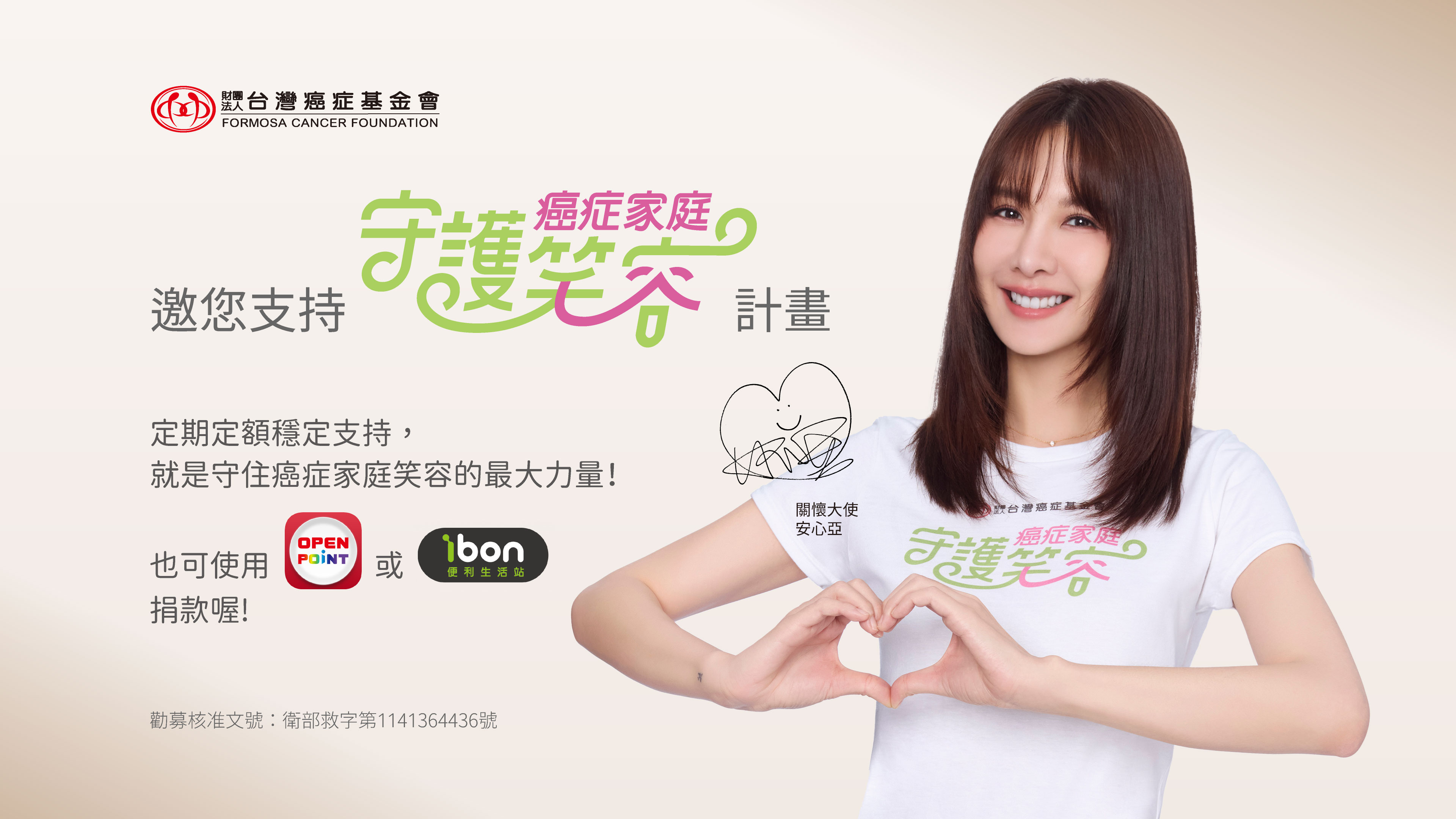 為了讓病友不再孤軍奮戰,台灣癌症基金會邀請癌友關懷大使安心亞加入行動,發起「守護癌症家庭笑容」公益專案。邀請您一起支持基金會提供的癌友關懷一站到位服務,給予多一點穩定的資源,就能多守護一個癌症家庭的笑容。