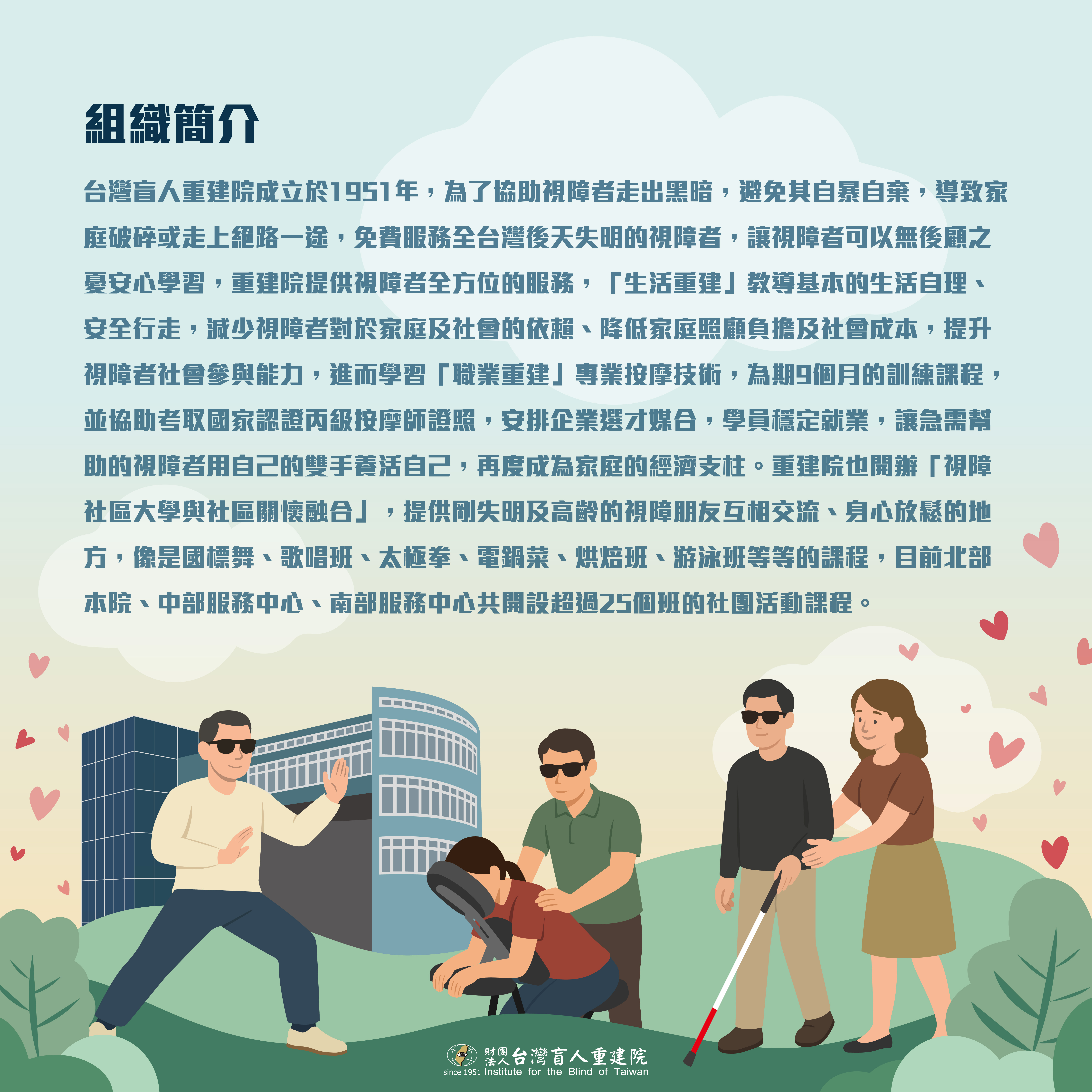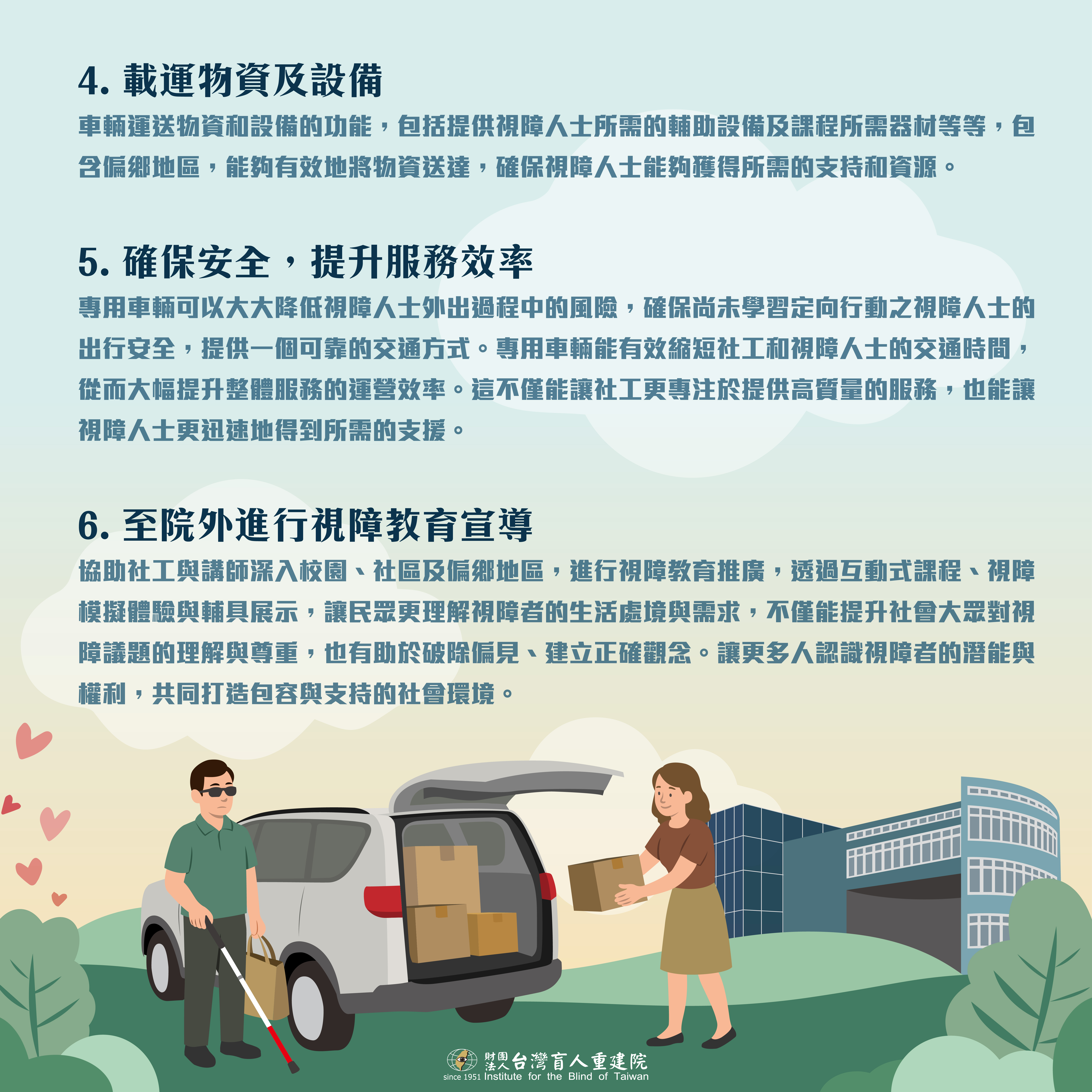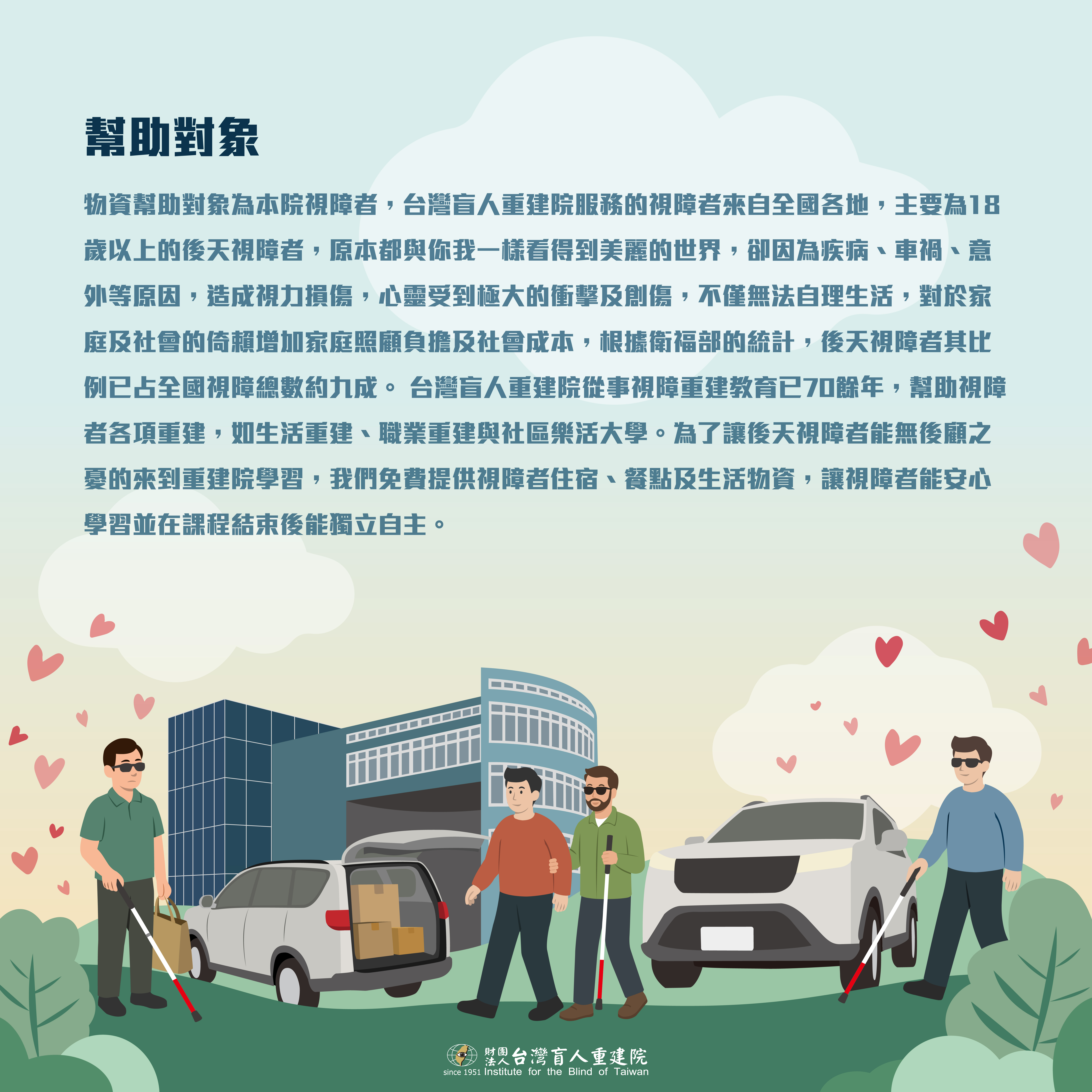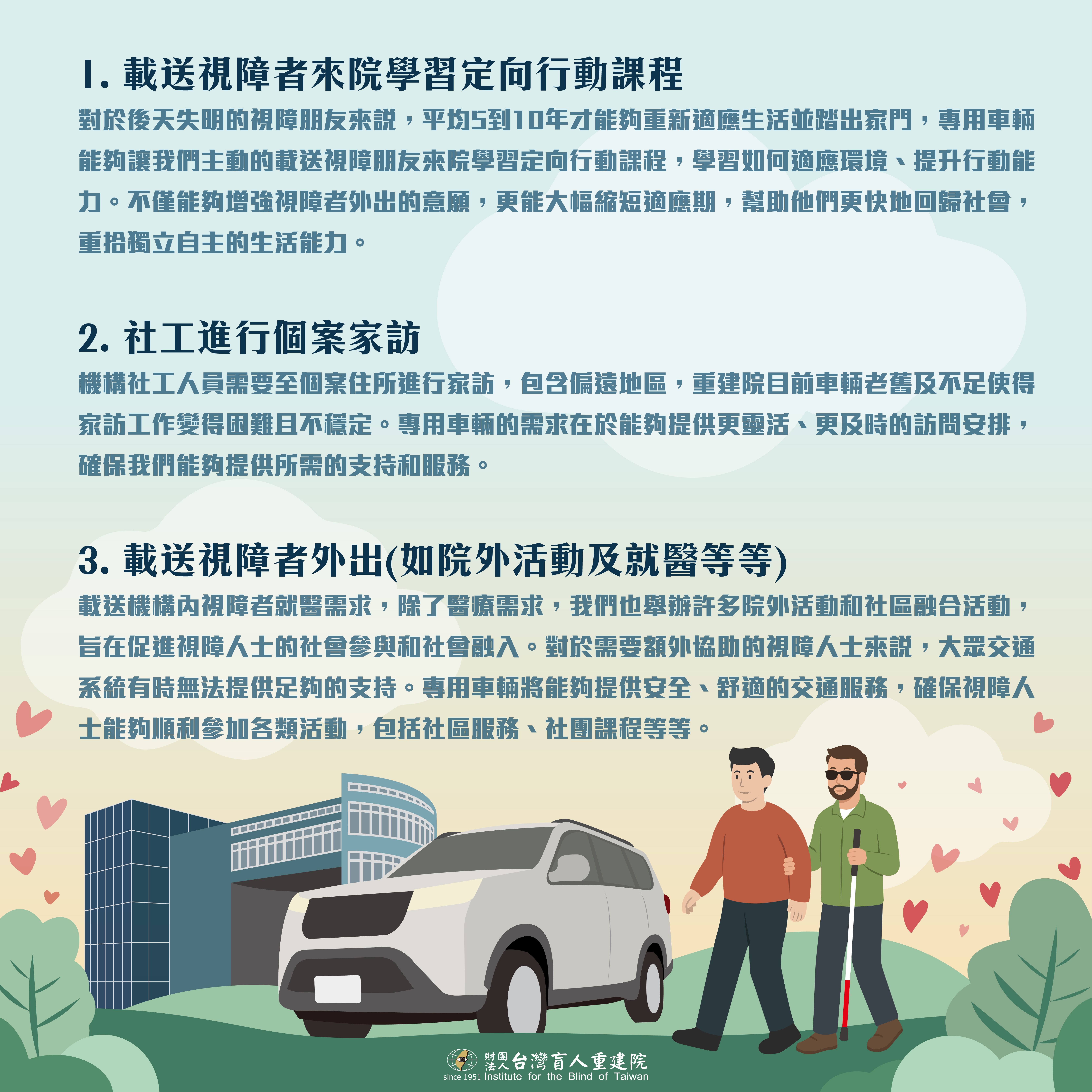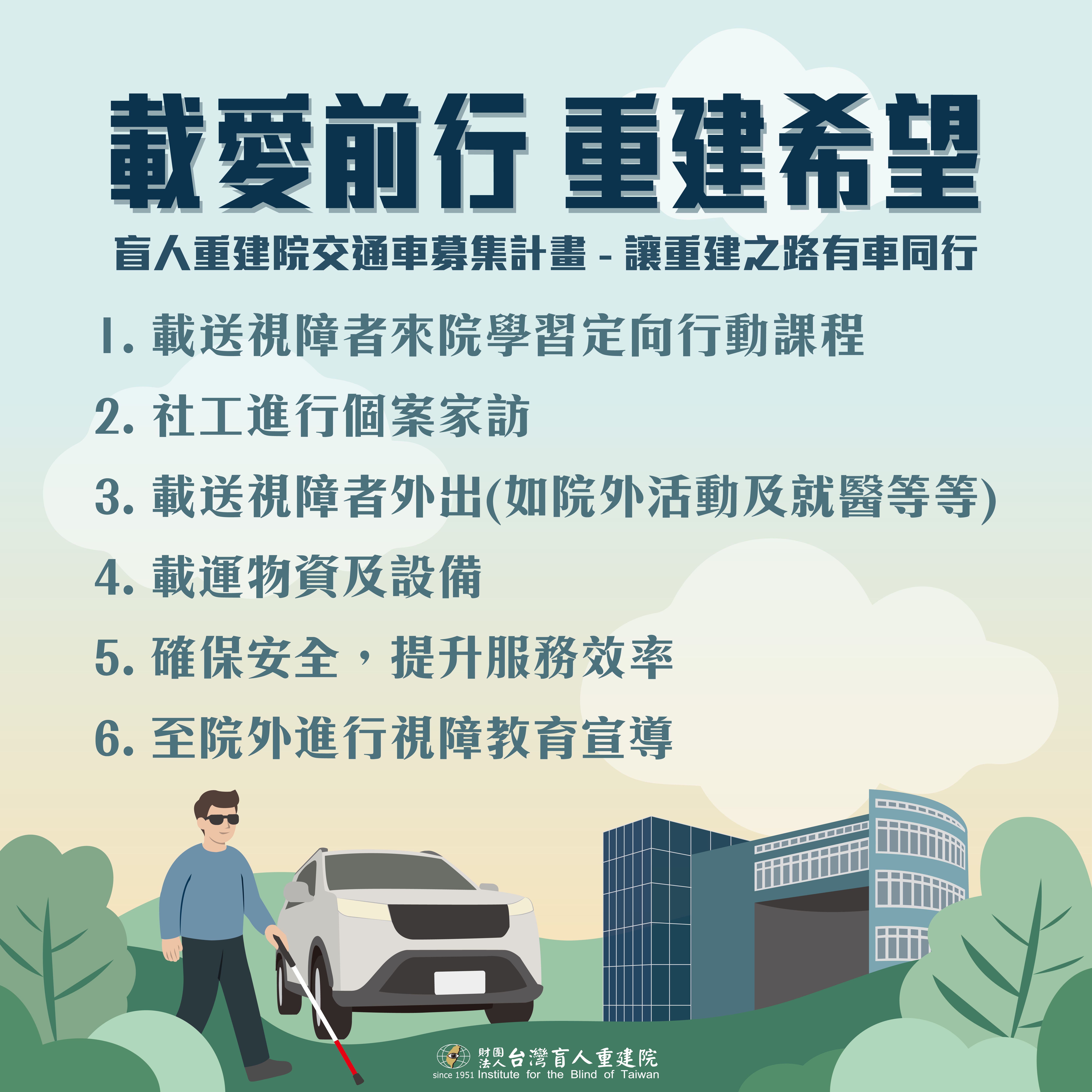 台灣盲人重建院現有車輛老舊且故障率高,無論是對於服務個案的安全性,或是工作人員的效率都會造成隱憂,希望大家能夠協助我們,幫助我們將機構的交通車汰舊換新,這不只是一台車,而是一條通往希望的道路,是連結你我與視障者的起點,邀請您加入「載愛前行,重建希望」的行列,讓每一段人生旅程,不再孤單!