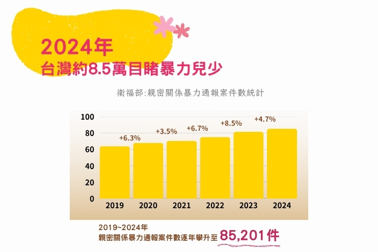 根據衛福部保護服務司統計,2019年起約6.3萬至2024年約8.5萬件親密關係暴力案件被通報,以逐年3.5%至8.5%不等的趨勢增長,每個案件中伴隨的兒少也暴露在家庭暴力中。