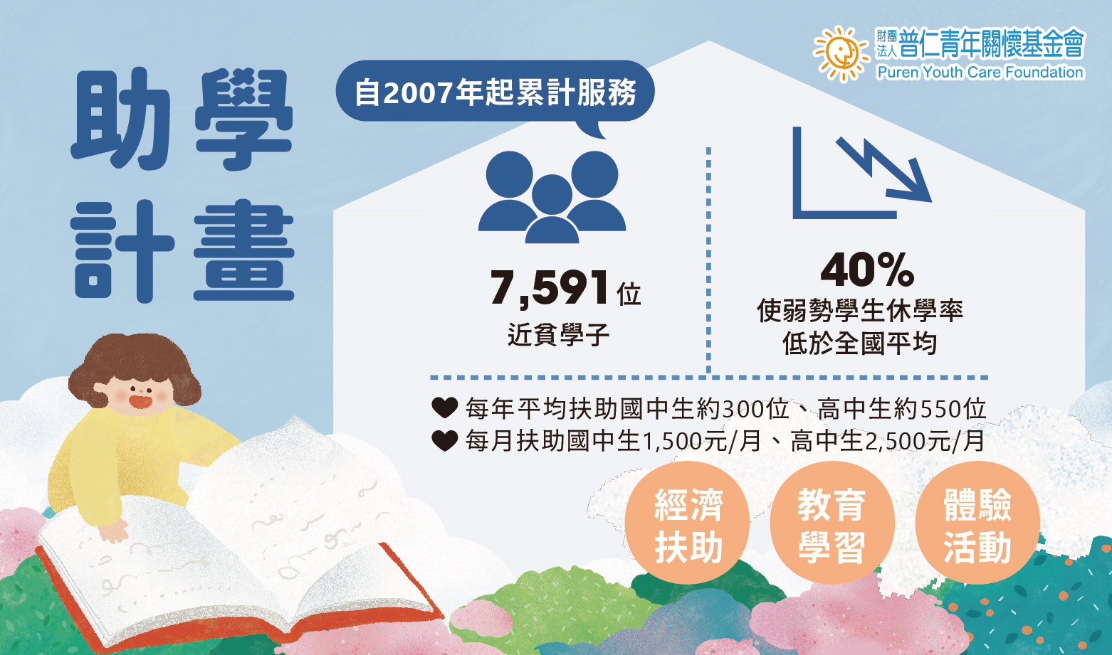 【助學計畫】2007年服務至今 服務對象為全台近貧弱勢之國、高中生。透過與學校合作,找出需要幫助的孩子,提供助學金、品格教育及多元的活動,讓孩子開拓視野,擁有不同人生體驗。 ❤️2026 年共扶助國中生 360 位,高中生 500 位,共計 860 位。