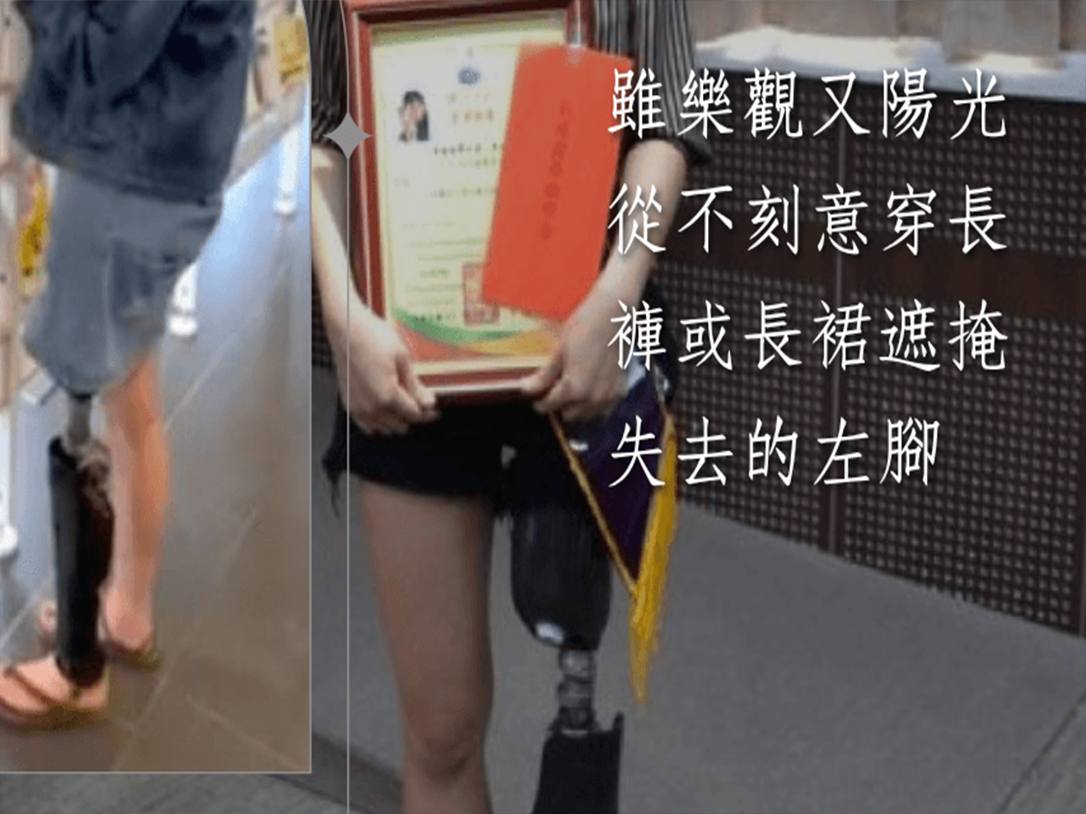 雖樂觀又陽光從不刻意穿長褲或長裙遮掩失去的左腳,走在校園路上,縱使步調緩慢卻走得堅定沒有被命運擊倒!