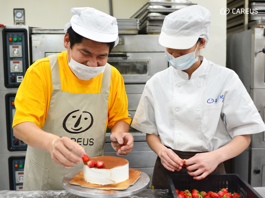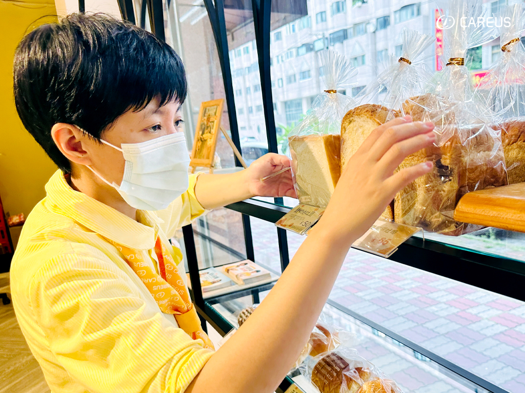 一位憨兒師傅,熟練的揉飪麵團、精準掌握烘烤時間。