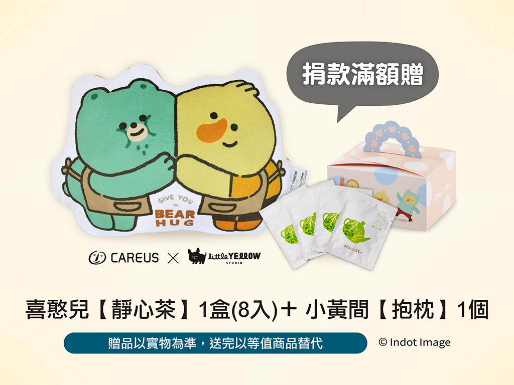• 單筆捐款2,400元,贈喜憨兒【靜心茶一盒(8入)+小黃間抱枕一組】。