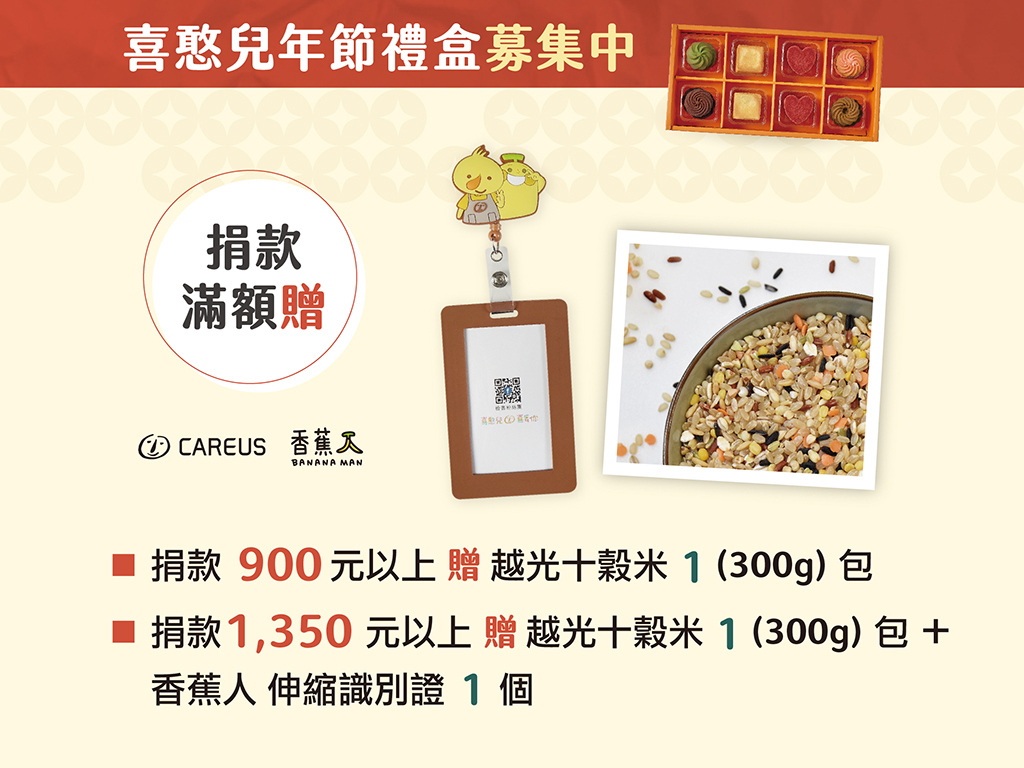 ✦捐款 1,350元,為3位小朋友送上新年祝福,為300位庇護工場的憨兒加油,贈【喜憨兒越光十穀米+香蕉人識別證夾】一組。