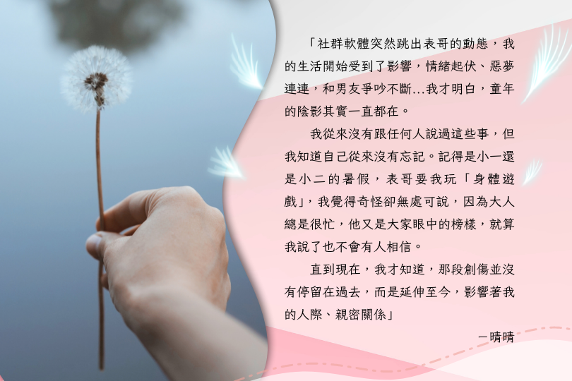 性創傷並非隨著時間就能淡去的傷口,許多倖存者背負的,不只是身體上的痛苦,而是長久盤踞在生命裡的陰影。特別是童年時期就經歷創傷的人,往往在成年後才意識到,當年的創傷仍影響著人際互動、親密關係與生活。反覆的創傷經驗,也讓他們常陷入自責、恐懼與孤立。這樣的早期創傷,使療癒之路更加艱難,需要長期、耐心而溫柔的陪伴,才能逐漸找回安全感,重新建立信任與力量。