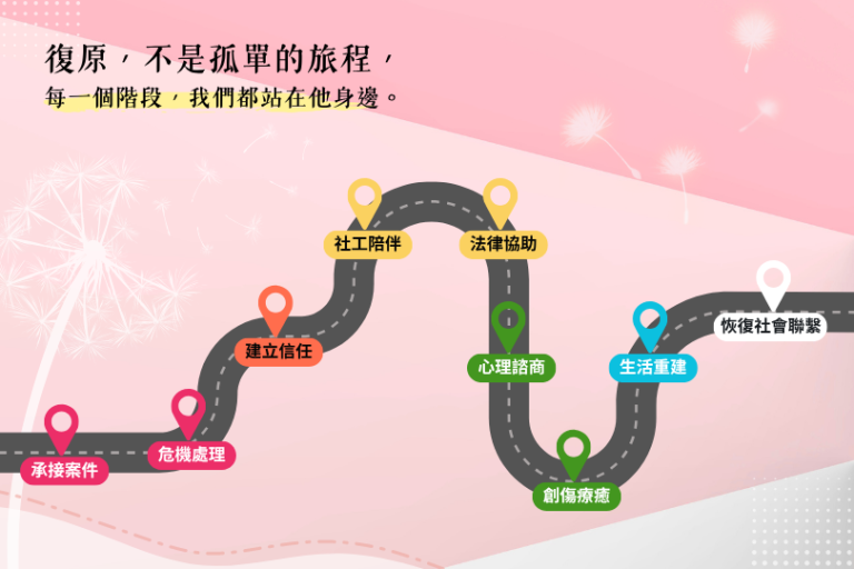 社工在第一時間陪伴倖存者度過危機,協助連結所需資源,提供法律諮詢與人身安全計畫,守護他們的權益與安全;同時,在每個階段持續建立信任、傾聽與支持,成為倖存者的重要依靠。
