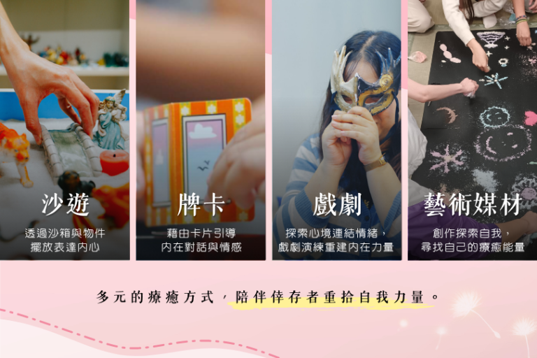 然而,在復原的歷程中,有些情緒難以用言語表達,因此我們也運用沙遊、戲劇、舞蹈、繪畫、卡牌、書寫、各式藝術媒材創作等非語言治療方式,陪伴倖存者在安全的空間和心理距離,重新與身體、情緒連結,慢慢找回自我照顧的能力並獲得療癒。