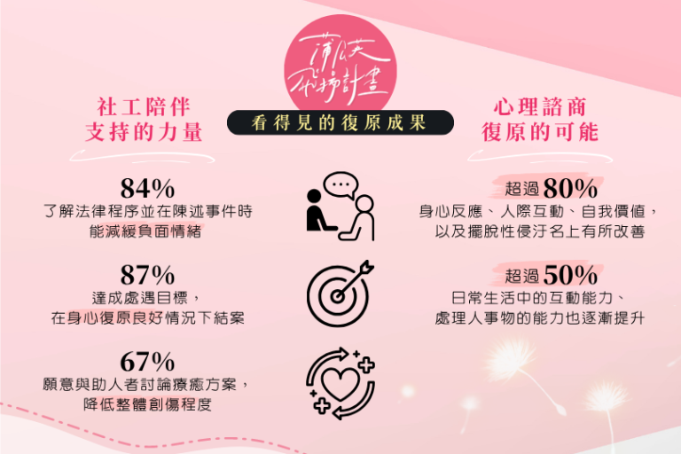 透過專業社工評估與心理諮商,我們整合司法、醫療與經濟等支持,為倖存者建立完整而穩固的安全網,確保他在不同生命階段, 都能獲得安全穩定的支持。