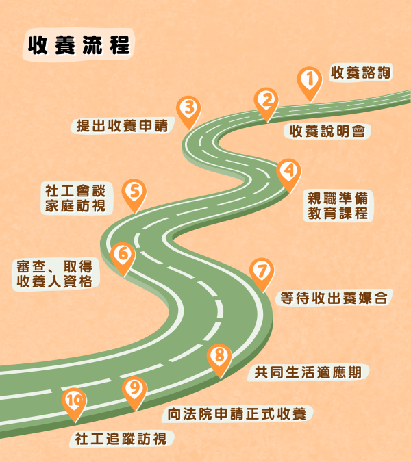 從收養人提出申請開始,一連串的諮詢、課程、評估與等待,直到收養完成時,至少需要歷經 2 年的時間,但也不是所有人都能成功走過這艱辛的考驗。