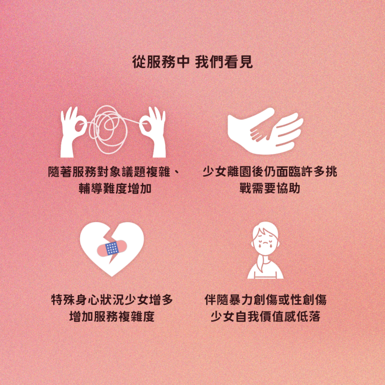 ●有特殊身心狀況的少女增多,如情緒障礙、過動、自閉、憂鬱傾向、智能邊緣等,需服用藥物控制,增加服務複雜度。