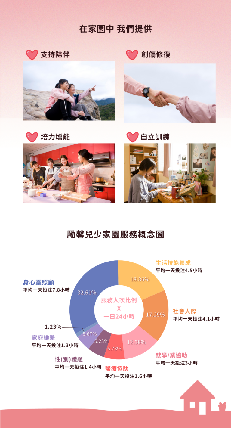 ●支持陪伴:24小時、風雨無阻的「替代性家庭服務模式」,滿足少女食、衣、住、行、育、樂等各方面之需求,提供安全、穩定的生活環境。