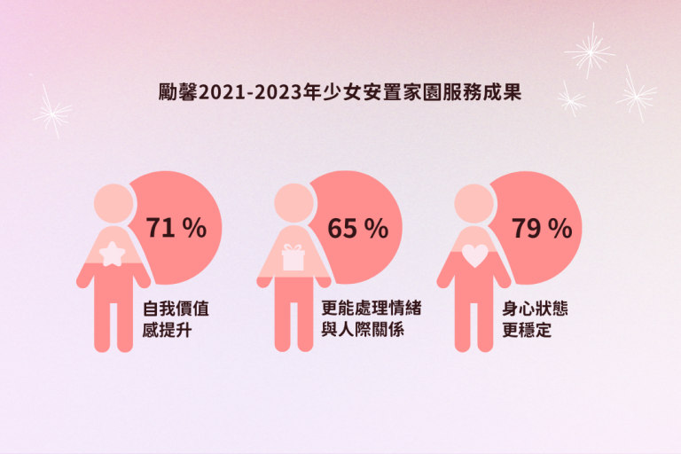勵馨基金會於全台的北、中、南等區域皆提供少女安置服務,提供穩定的生活照顧外,協助少女追求全面的發展與自立。勵馨少女安置家園每年服務近100名少女,近五年統計,平均有42%的女孩遭受過性暴力(性侵害、性猥褻)、30%的女孩家庭失功能、14%遭受過家暴/身心虐待等。