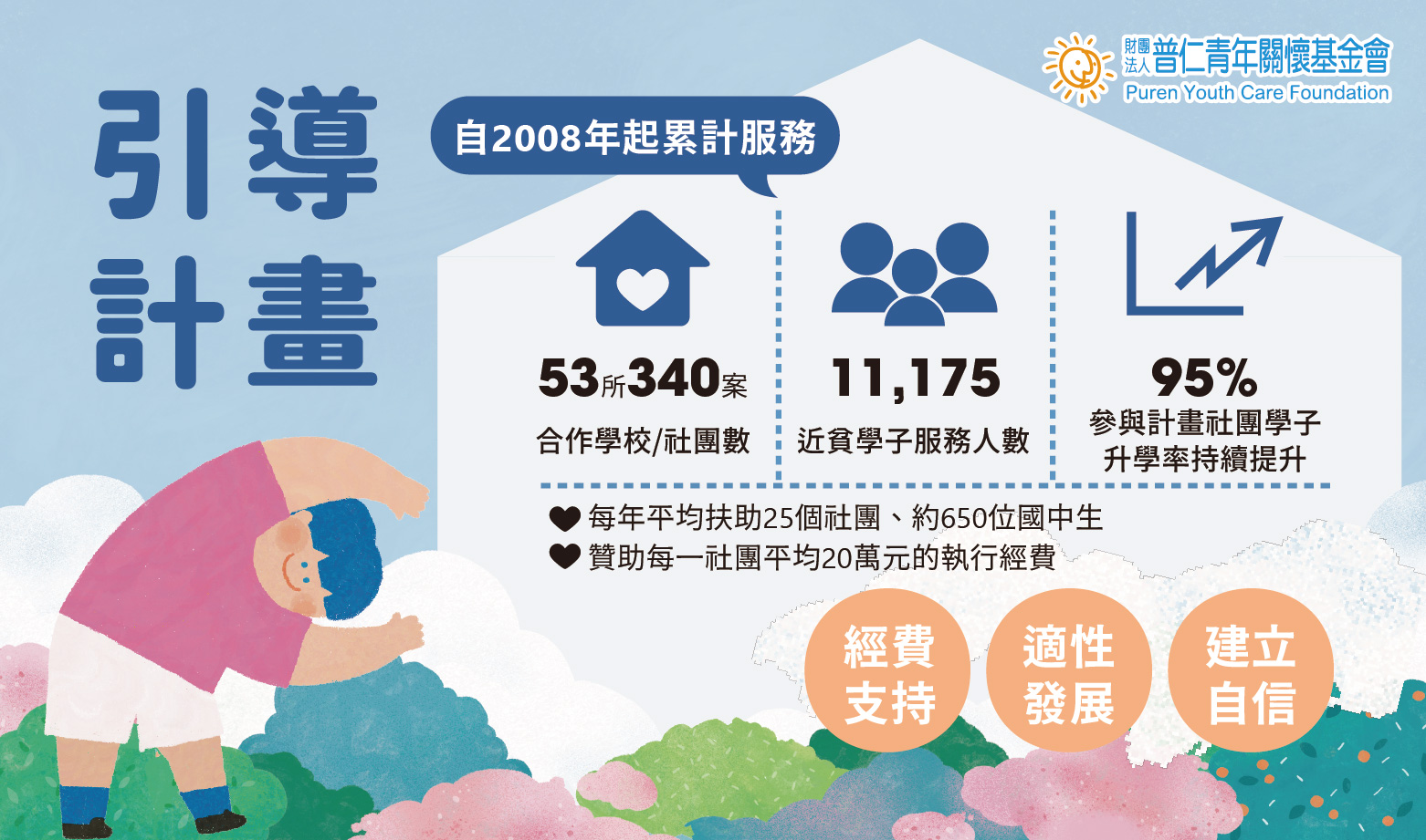 【引導計畫】2008年服務至今 普仁支持全台學校社團,引導「高關懷學生」參與社團,從中找到學習動機與建立自信心,深化同儕合作,並提高對學校認同度。 ❤️2025年扶助國中社團21案;人數:約466人 平均一個社團贊助約20萬元的執行經費